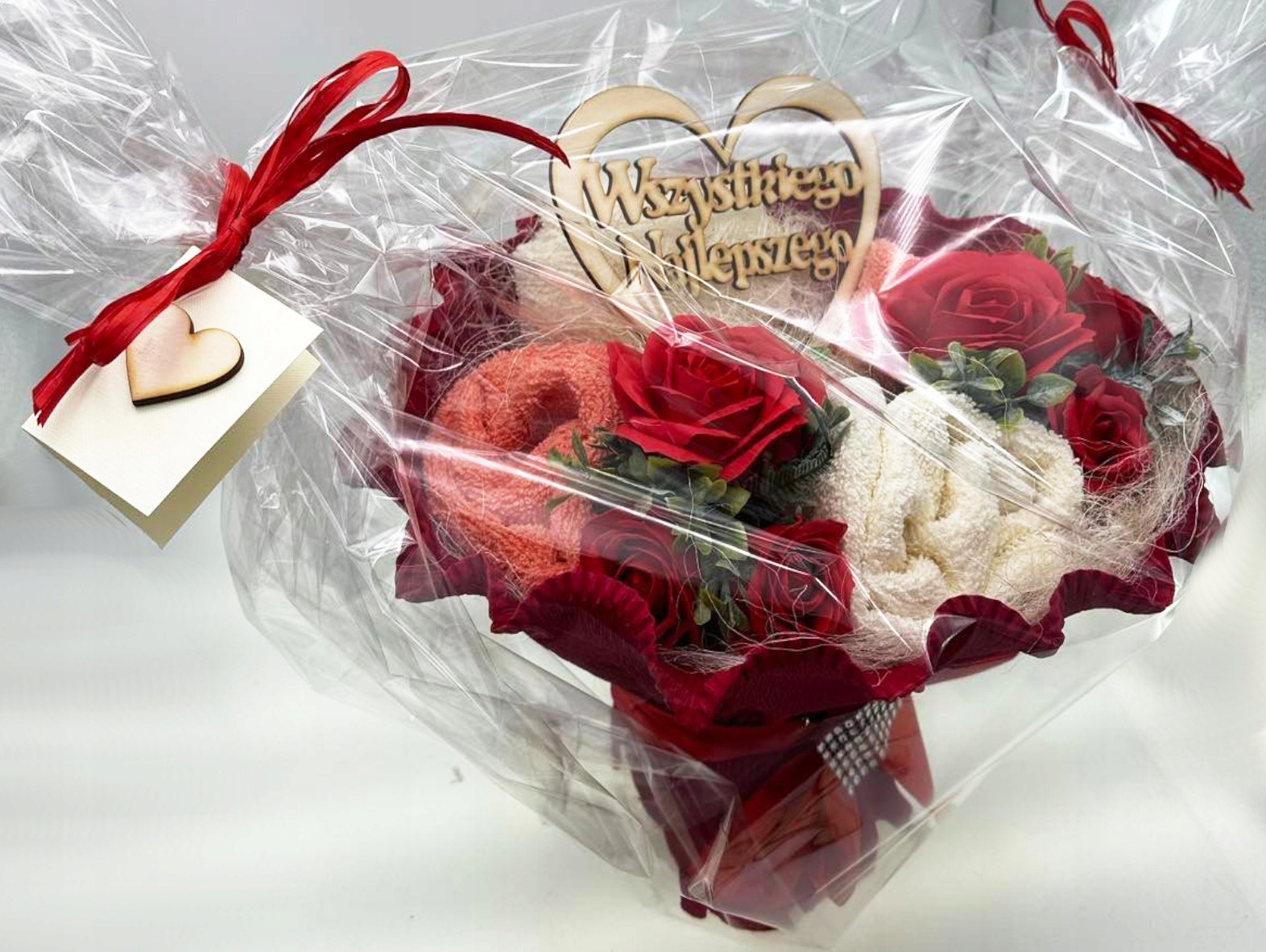 Не ищите дальше! Наш букет из полотенец представляет собой идеальное сочетание элегантности и функциональности. Вместо цветов, которые завянут, подарите букет из двух качественных полотенец, красиво украшенных мыльными цветами и деревянным сердцем.