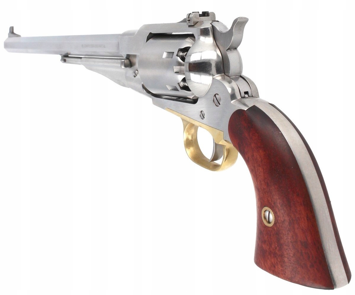 Шестизарядный ударный револьвер Remington 1858 New Model Army Inox .44 в корпусе из нержавеющей стали стальное исполнение – обеспечивает превосходную защиту от коррозийных свойств продуктов сгорания, черного пороха. Дульнозарядная копия одного из самых известных ударных револьверов Ремингтон. Закрытая стальная рама и тщательная обработка влияют на точность и повторяемость выстрелов.