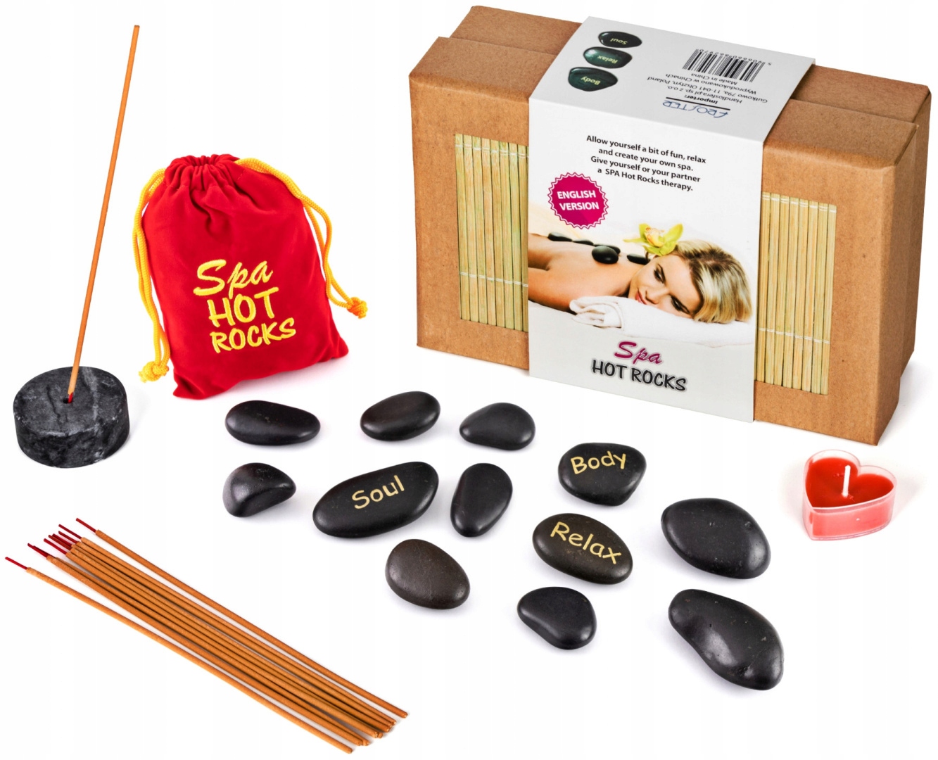 Состав набора: 12 базальтовых камней в мешочке, набор ароматических палочек с подставкой, свеча в форме сердца, инструкция. В набор входят натуральные камни, которые по форме и размеру могут отличаться от тех, что видны на фотографиях. На трёх крупнейших камнях выгравированы надписи. Камни следует поместить в горячую воду согласно инструкции.