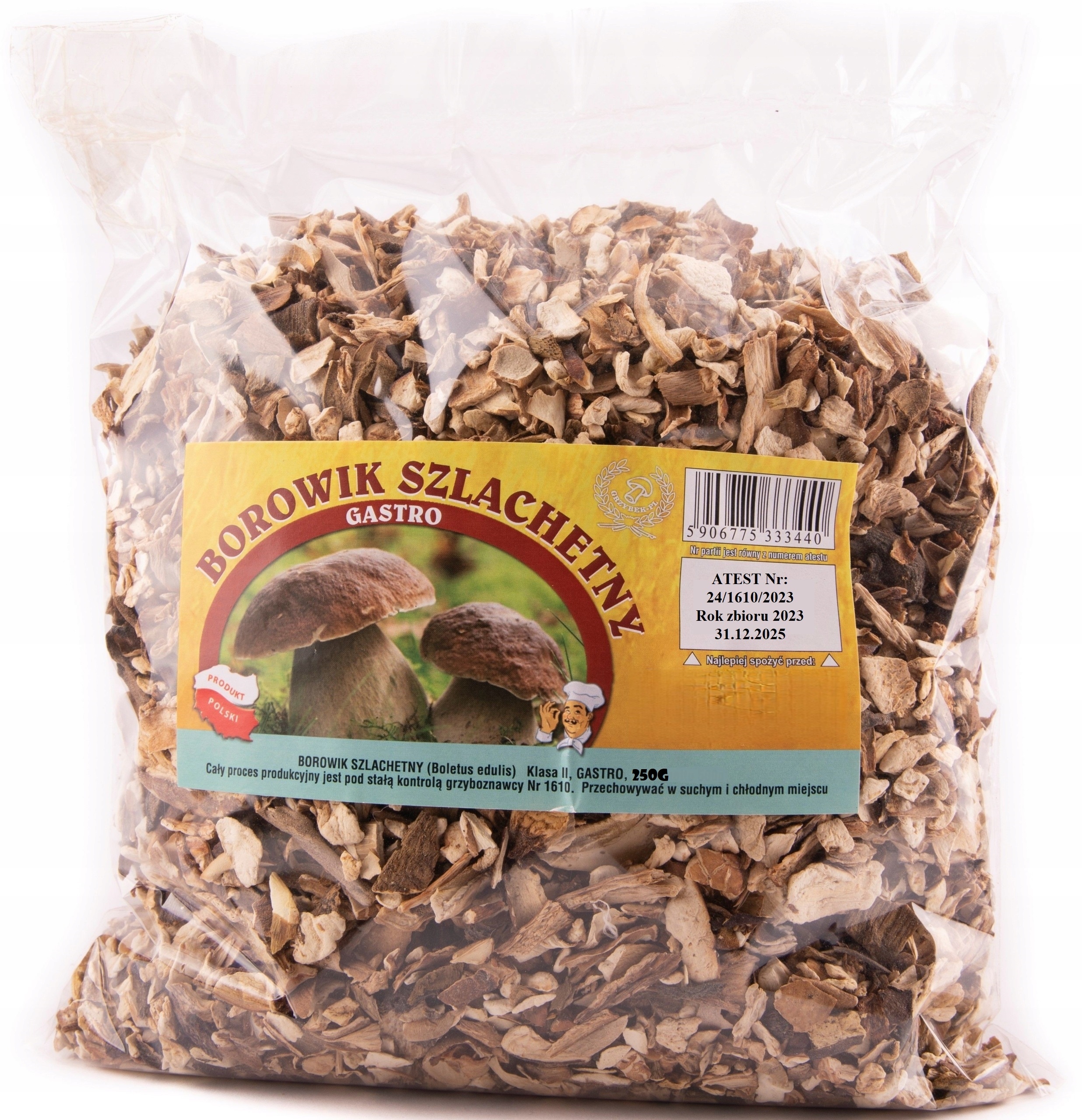 ЭТИКЕТКА ПРОДУКТА включает СЕРТИФИКАТ с номером грибного эксперта и подтвержденным годом сбора урожая.
