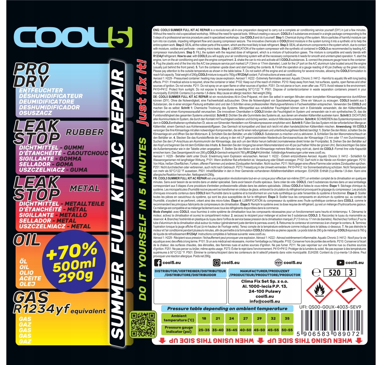 *Препарат для кондиционеров COOL5 полностью совместим со всеми маслами, используемыми в системах кондиционирования воздуха - Эстер и ПАГ (синтетические и минералы).