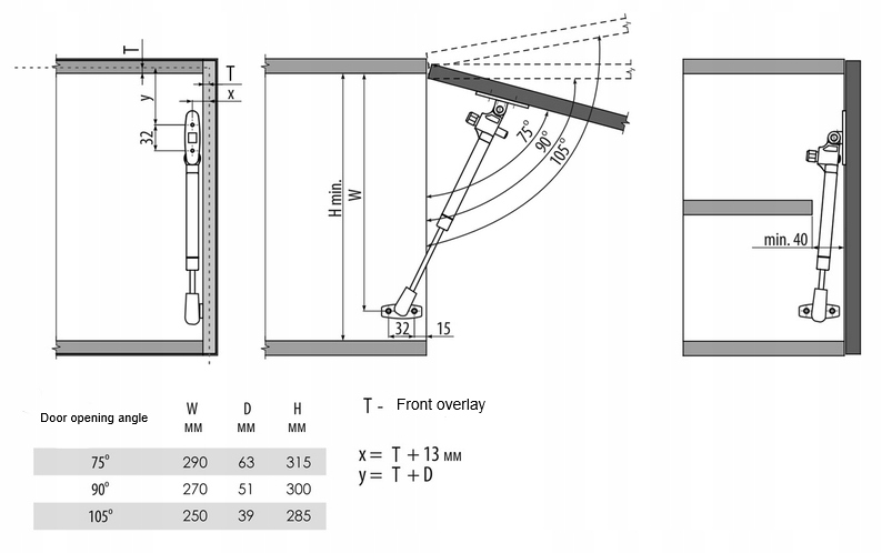 - регулируемый угол открывания передней панели 75, 90, 105 градусов