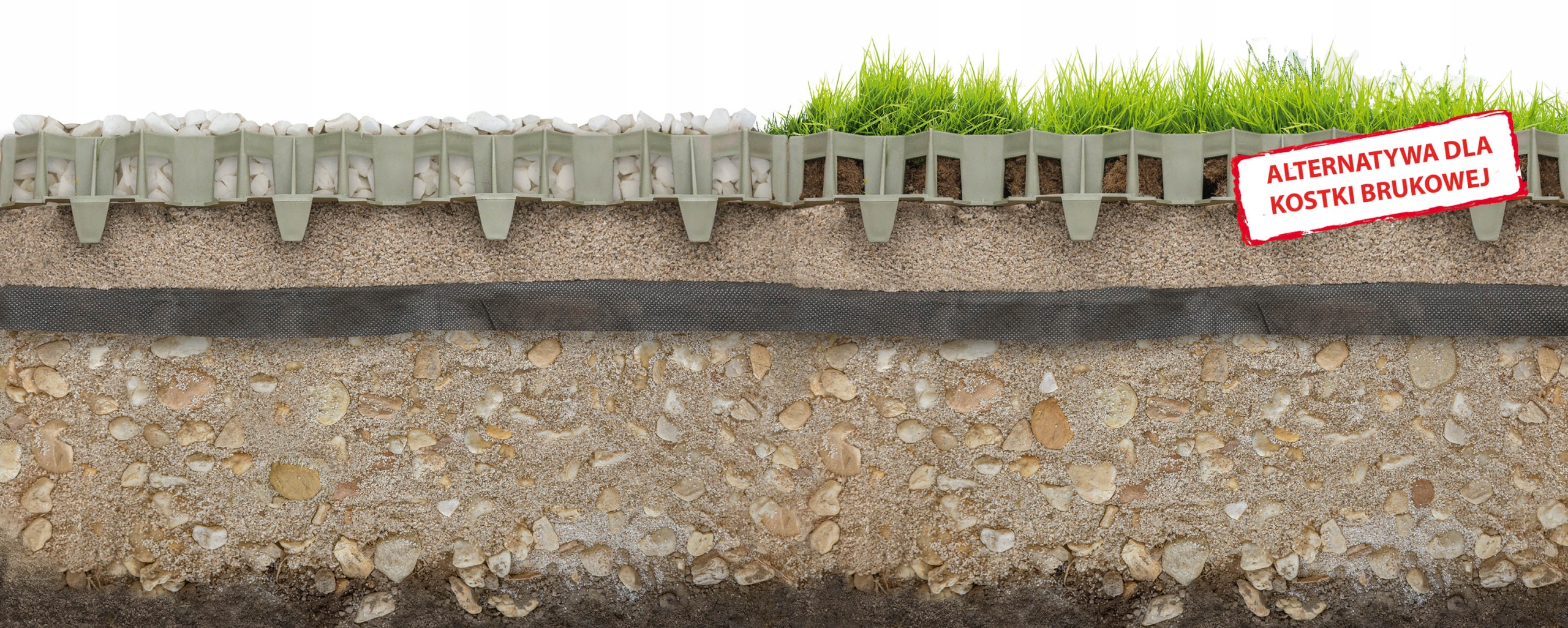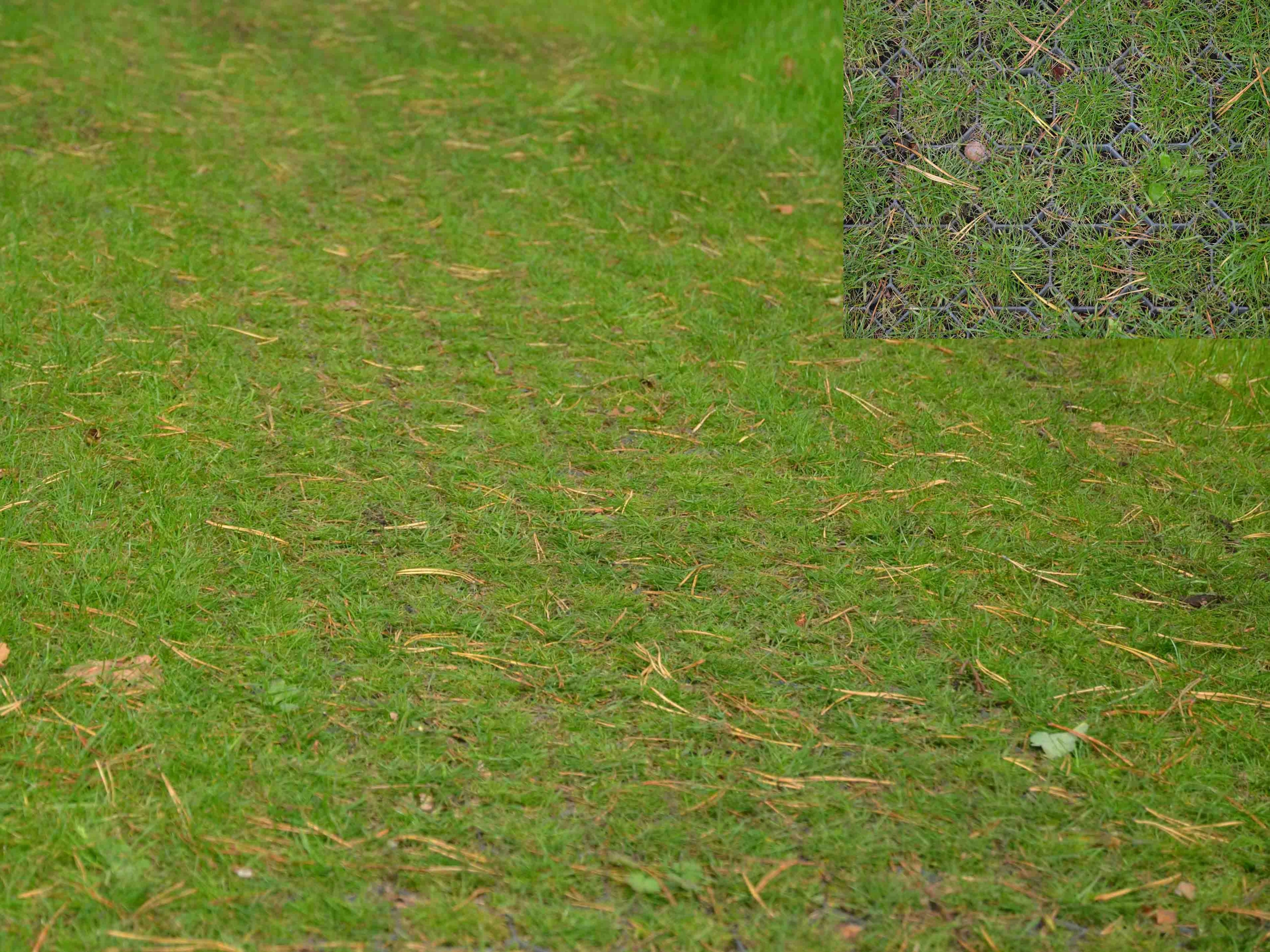 Сетка для создания дорожных покрытий (проездов, парковочных мест, тротуаров и дорожек) с ячейками, заполненными травой или заполнителем (камнями)