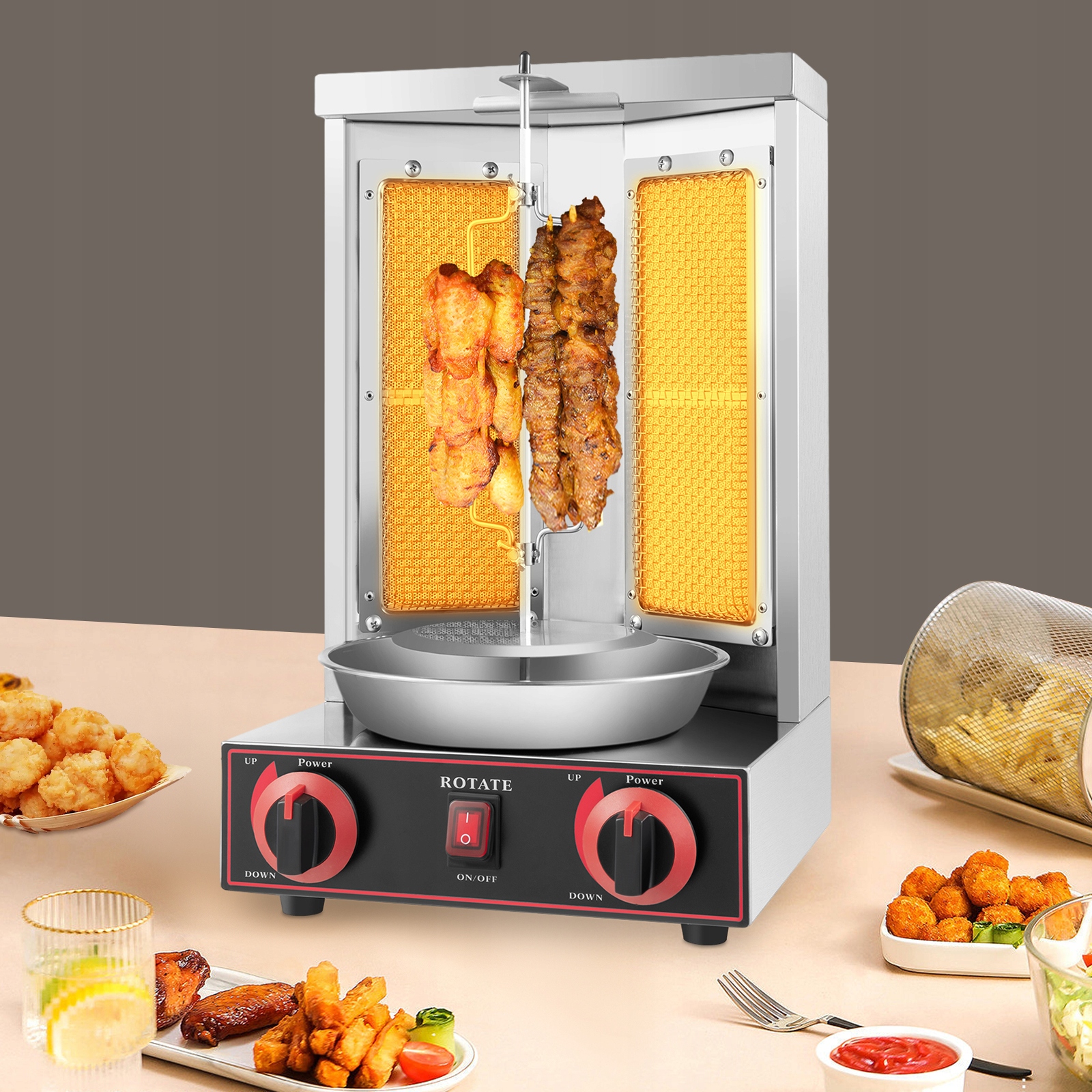 Подходит для отелей, партнерских магазинов, ресторанов, баров быстрого питания, сетевых магазинов, домов и т. д. Его можно использовать как на открытом воздухе, так и в помещении. Идеально подходит для запекания курицы, индейки, тако и мяса для шаурмы.