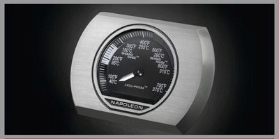 Гриль оснащен термометром, встроенным в крышку гриля. Термометр AccuProbe позволяет точно определить температуру внутри духовки. Шкала термометра показывает рекомендуемые диапазоны температур, подходящие для копчения, запекания и жарки, что очень полезно, особенно когда мы только начинаем свое приключение с газовым грилем.