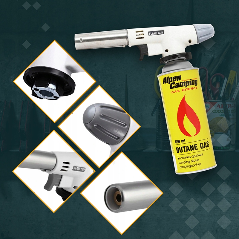 ➡️ Газовый паяльник Flame Gun мощностью 1120 Вт оснащен пьезорозжигом, металлическим клапаном и ручкой регулировки силы пламени газового картриджа TS-705.