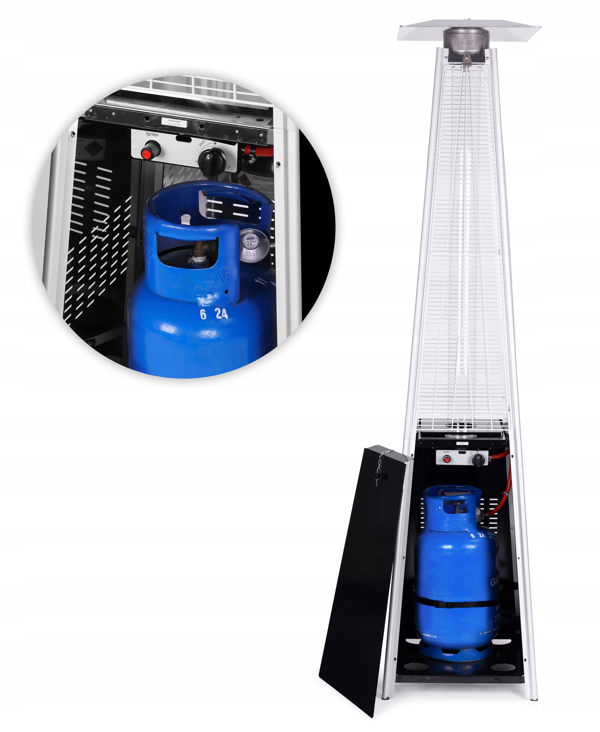Нагреватель имеет специальное закрытое пространство для газового цилиндра, которое обеспечивает не только эстетический вид , но и большую безопасность . Двери закрыты магнитом и обеспечивают свободный доступ к цилиндре и панели управления, это решение делает цилиндр невидимым, а обогреватель сохраняет элегантную конструкцию и высокий уровень безопасности. Кроме того, цилиндр защищен специальным поясом , который стабилизирует его при расчете и транспортировке. Соединение цилиндра с 11 кг.