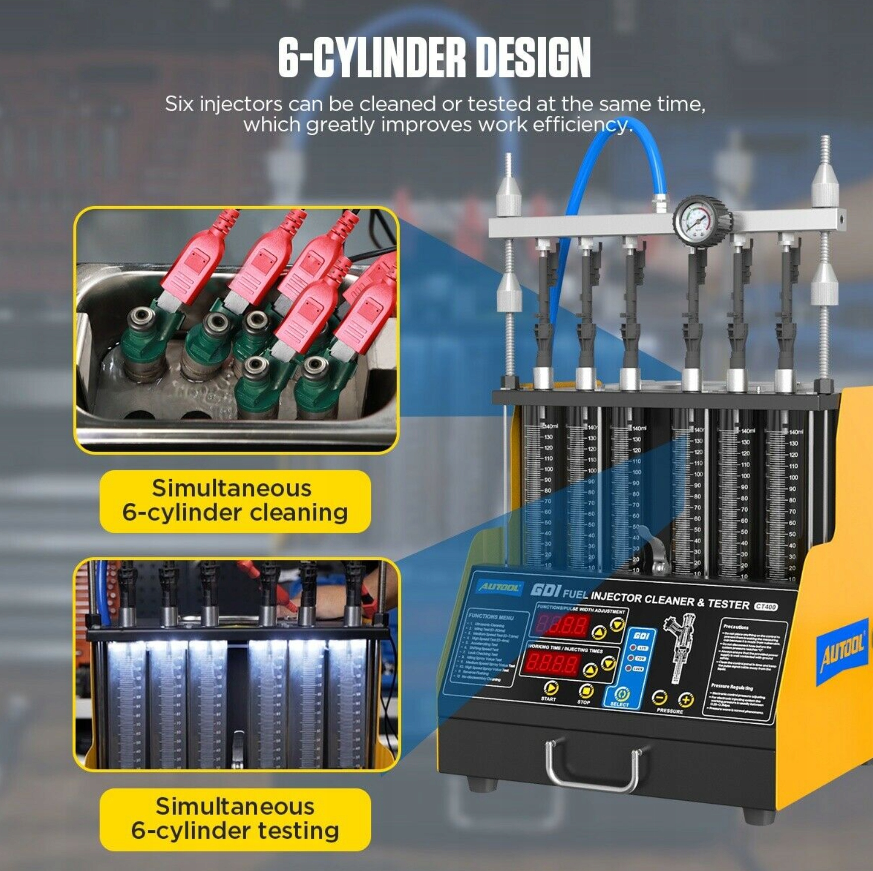 В связи с растущей зрелостью и использованием системы непосредственного впрыска бензина компания AUTOOL в 2021 году выпустила устройство для очистки и проверки форсунок CT400 GDI. Прямой впрыск бензина — это технология, при которой топливо впрыскивается непосредственно в цилиндр и смешивается с всасываемым воздухом. По сравнению с обычными форсунками использование GDI может помочь повысить эффективность двигателя и удельную мощность, а также снизить выбросы выхлопных газов. CT400 не только поддерживает топливные форсунки GDI, EFI, FSI и другие типы, но также совместим со стандартными топливными форсунками. CT400 доступен с тремя напряжениями питания для форсунок GDI: 12 В, 70 В и 120 В, что в основном подходит для форсунок большинства марок автомобилей в Европе, Америке и Азии.