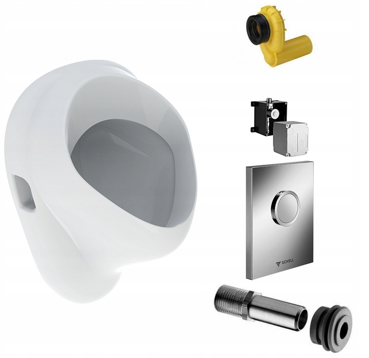 Комплектация с писсуаром - горизонтальный подвод воды и горизонтальный отток в канализацию. В комплект входит бачок SCHELL для скрытого монтажа. установка с кнопкой цвета глянцевый хром.Комплект для установки без рамки!