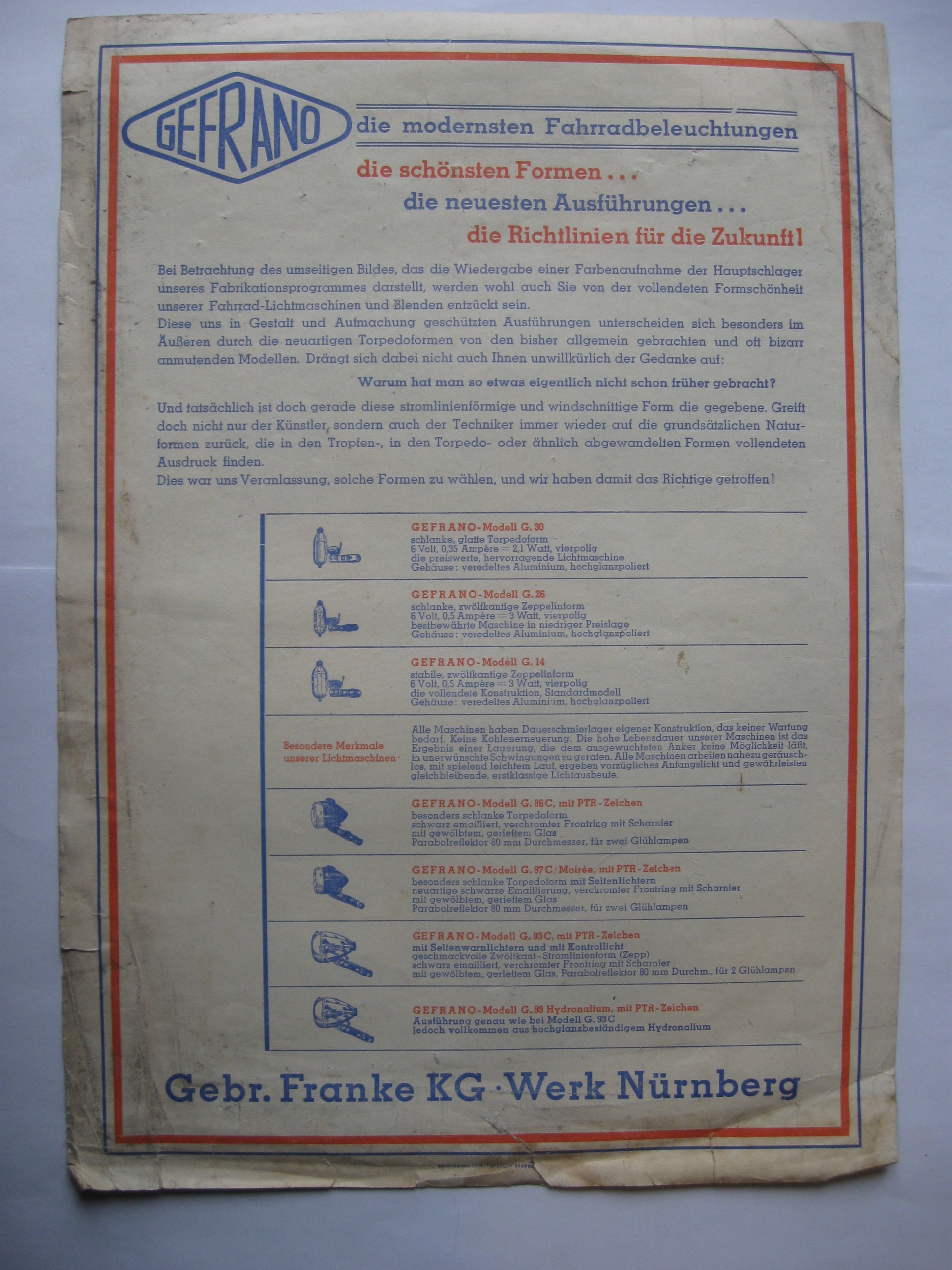 Оригинал довоенная реклама фонарей велосипедов GEFRANO.