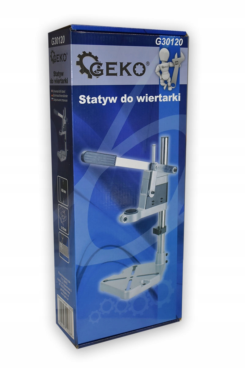 Стойка для дрели GEKO, позволяющая использовать ручную дрель в качестве колонной дрели. Он предназначен для перпендикулярного сверления, с максимальным ходом 65 мм и максимальной рабочей высотой 430 мм.