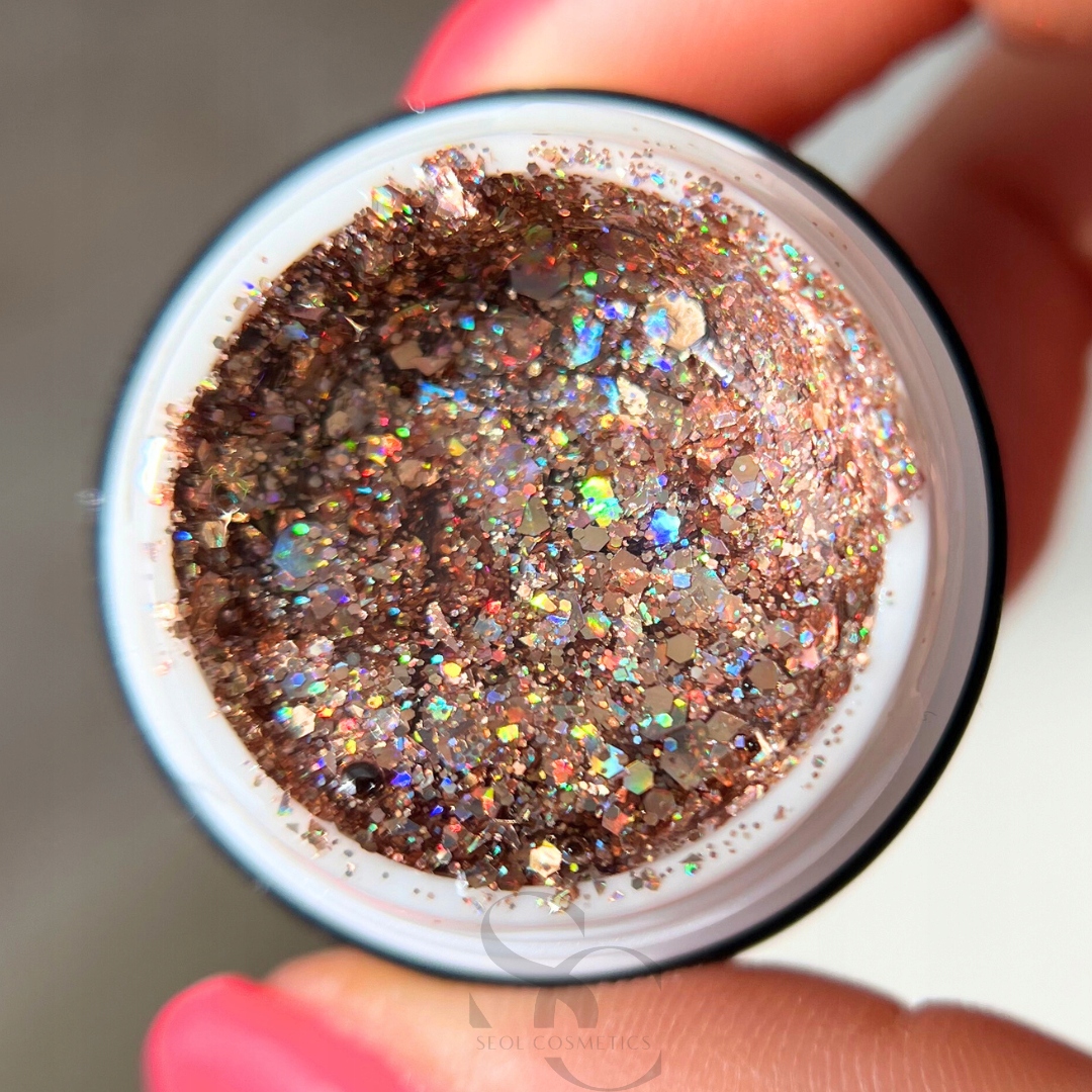 Разноцветные кусочки различных размеров и форм, которые, отражая свет, создают потрясающий эффект свечения, интенсивность которого можно регулировать, подобрав соответствующий количество частиц.Консистенция геля средняя густая, что облегчает его распределение, особенно по кутикуле.