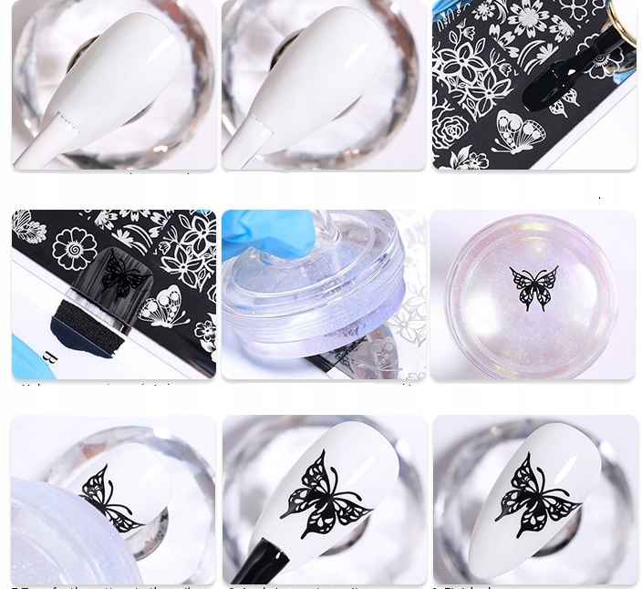 Штамп идеально подходит для точногонанесения узоров на ногти. Благодаря ему вы сможете быстро и легко создать привлекательную укладку. Удобная ручка обеспечивает комфортную работу. В комплект входит скретч-карта, которая позволит удалить с пластины излишки лака. Благодаря прозрачному силиконовому каучуку и окошку в верхней части штампа можно наносить очень точные узоры. Сквозь штамп вы можете видеть в видоискателе/видоискателе наносимый рисунок.