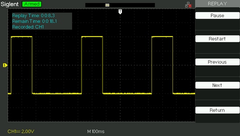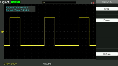 Регистратор формы сигнала (так называемый рекордер) может записывать форму входного сигнала из каналов 1 и 2 с максимальной длиной записи 2500 рамки. Эту функцию записи также можно активировать с помощью выходного сигнала выбора «годен/не годен», что делает ее особенно полезной для регистрации необычных сигналов в течение длительного периода времени без необходимости постоянного мониторинга. Осциллограф SDS1052DL+ имеет встроенную память емкостью 7 МБ для записывающего устройства, а также поддерживает внешнюю память USB.