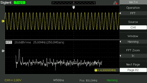 Осциллограф SDS1052DL+ оснащен 5 математическими функциями, которые позволяют: складывать, вычитать, умножать и делить сигналы каналов CH1 и CH2. Пятая функция — спектральный анализ БПФ, отображаемый на разделенном экране осциллографа.