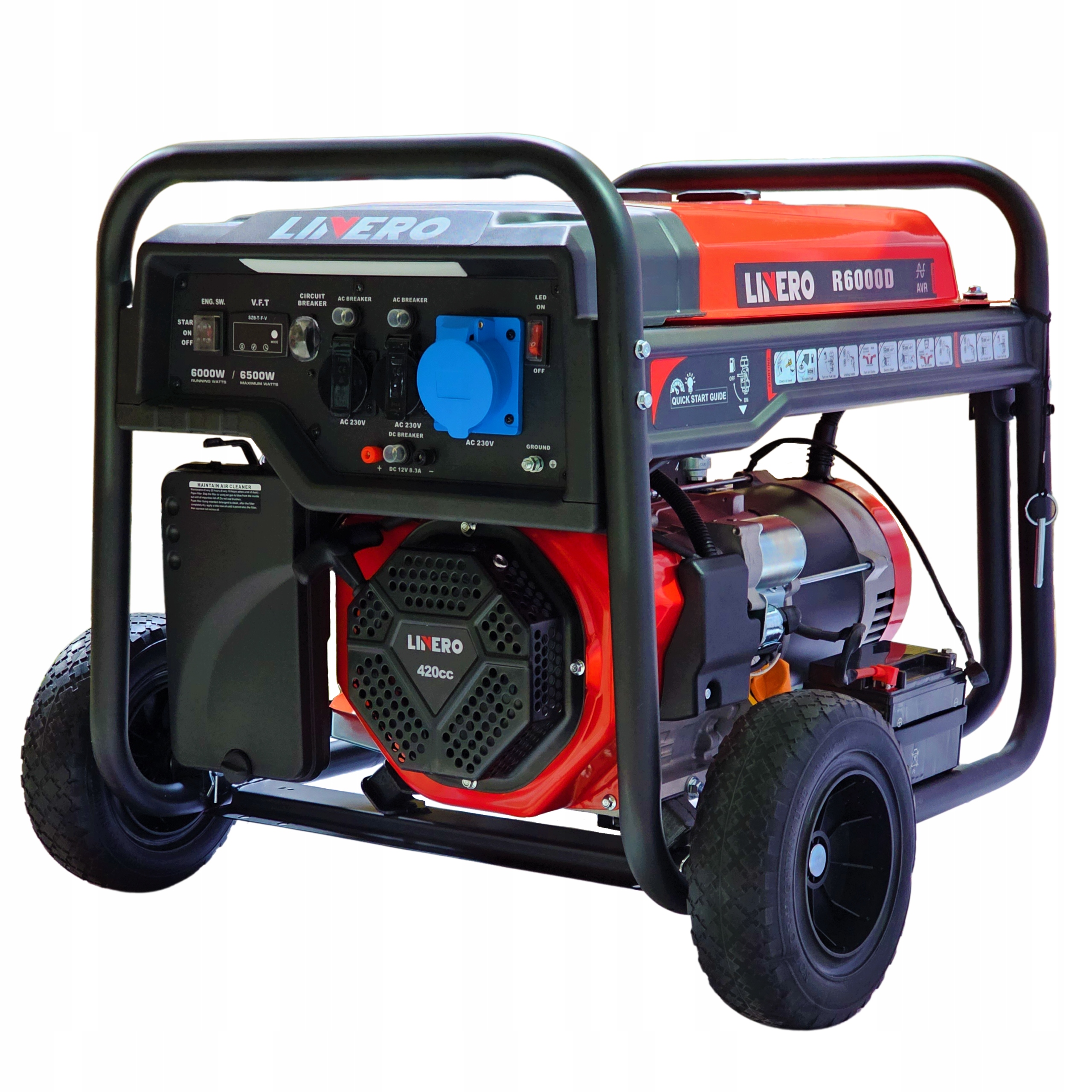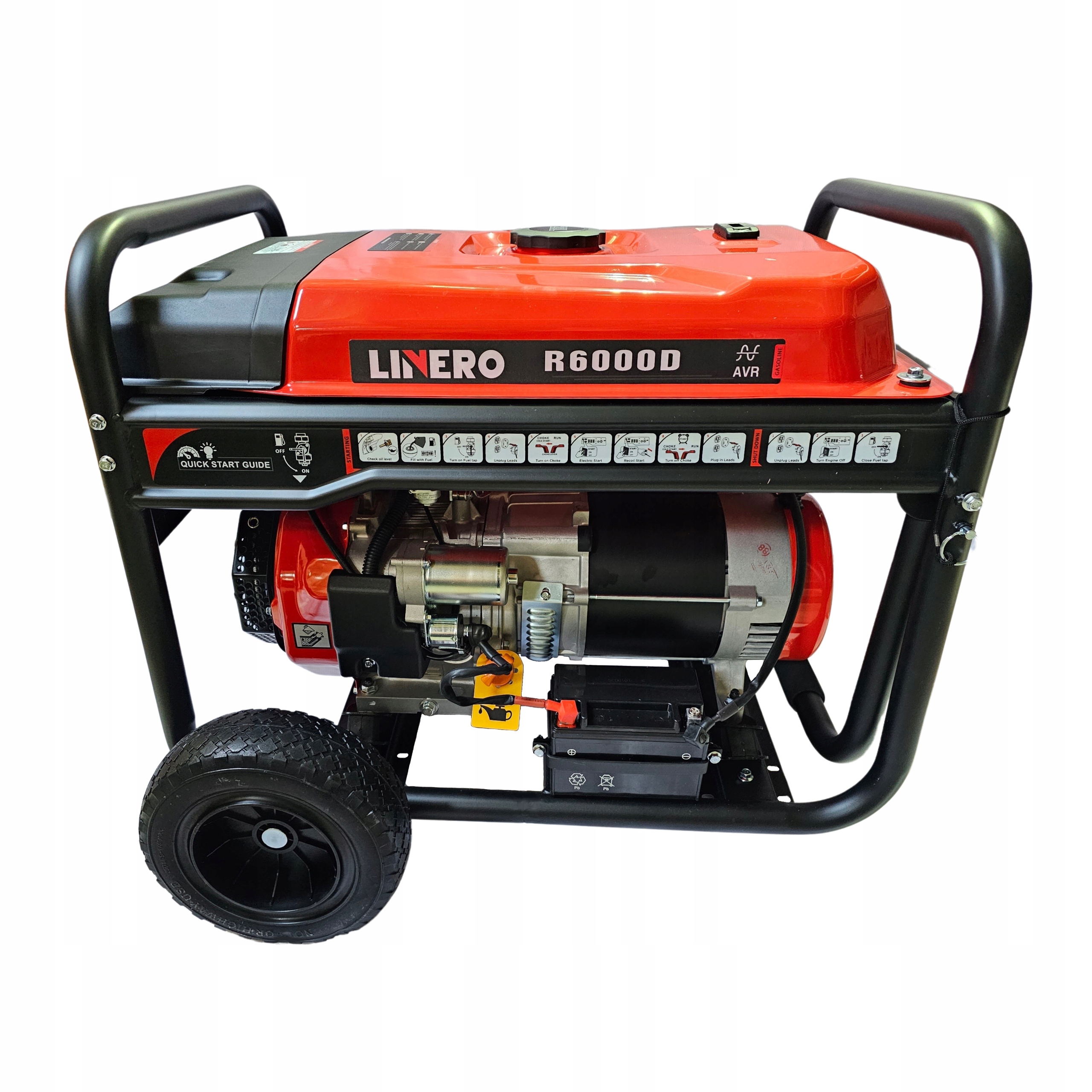 LINERO R6000D 6–6,5 кВт, 1 ФАЗА, БЕНЗИН, ЭЛЕКТРОСТАРТЕР, СТАБИЛИЗАЦИЯ НАПРЯЖЕНИЯ AVR, БОЛЬШОЙ ТОПЛИВНЫЙ БАК ОБЪЕМОМ 28 ЛИТРОВ, КОЛЕСА И СКЛАДНАЯ РУЧКА
