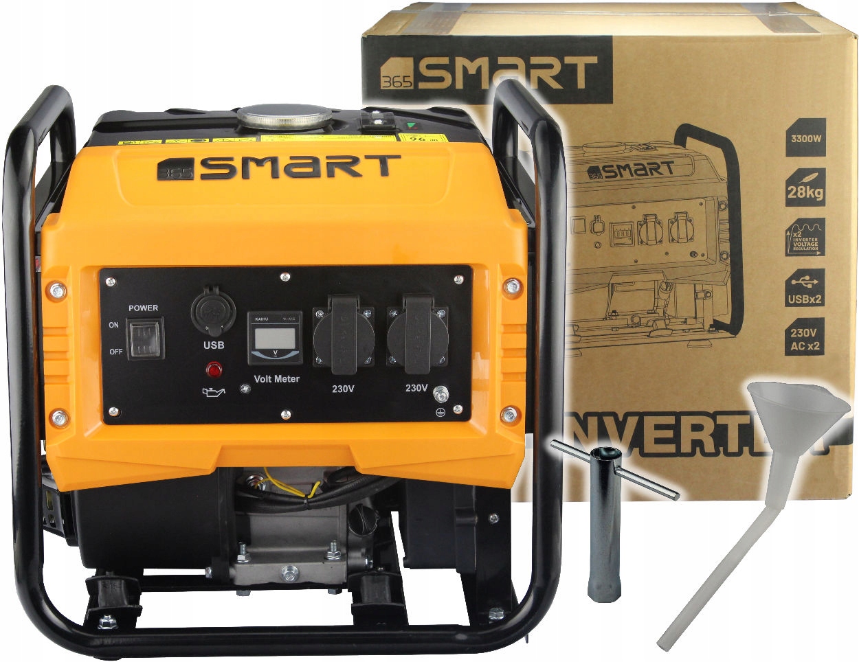 • Оснащен двумя розетками 230 В, термозащитой и датчиком масла при обнаружении нехватки масла выключает двигатель.