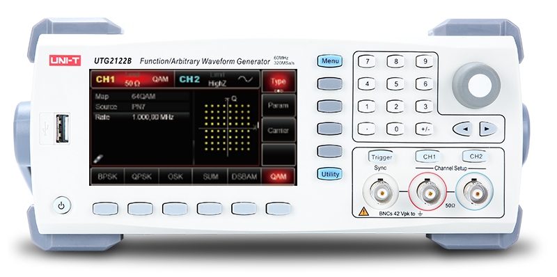 Функциональный генератор UTG2082B имеет два независимых канала с максимальной частотой до 80 МГц и частотой дискретизации 320 Мвыб/с. Устройство генерирует, среди прочего, синусоидальную волну, прямоугольную волну, пилообразную волну, сигнал постоянного тока и сигнал произвольной формы. Кроме того, функции BURST и SWEEP расширяют возможности тестирования подключенных систем. Генератор позволяет модулировать частоты FM, амплитуды AM и многие другие. Вертикальное разрешение генерируемого сигнала составляет 16 бит. Большой, четкий, цветной ЖК-дисплей обеспечивает комфортную работу устройства. Интерфейс связи USB обеспечивает связь с компьютером.