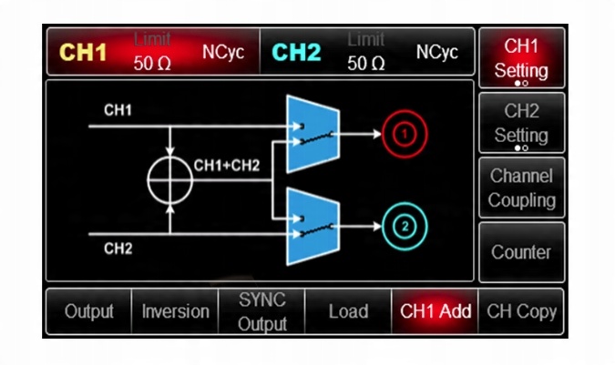 Генератор позволяет включить связь обоих каналов. При изменении частоты, амплитуды или фазового сдвига на одном канале изменение также будет произведено и на другом.
