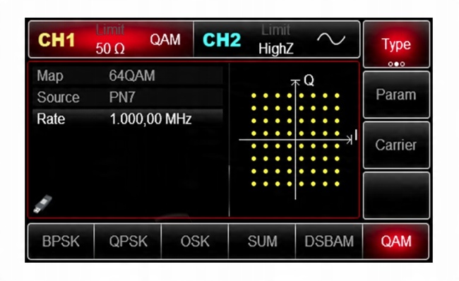 Широкий выбор цифровой и аналоговой модуляции. Тип модуляции: AM. FM, PM, PWM, ASK, FSK, PSK, BPSK, QPSK, OSK, DSB-AM, SUM, QAM