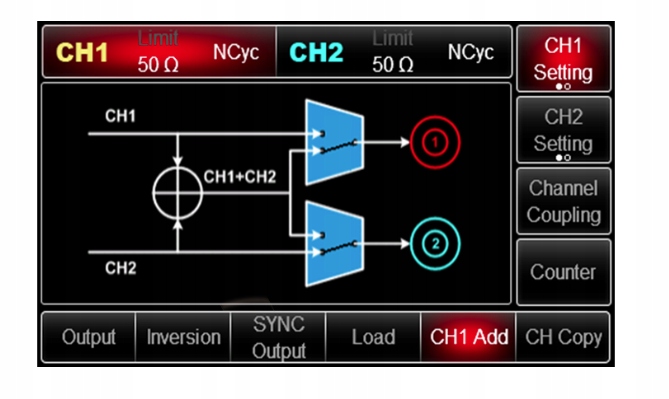Генератор позволяет включить связь обоих каналов. При изменении частоты, амплитуды или фазового сдвига на одном канале изменение также будет произведено и на другом.