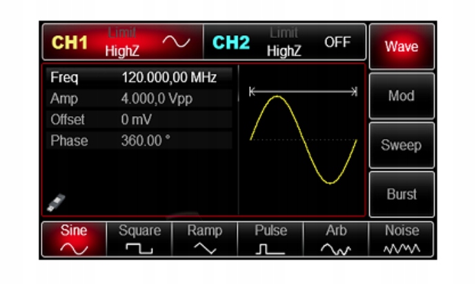 Максимальная выходная частота генерируемого сигнала составляет 60 МГц. Устройство позволяет генерировать множество различных форм сигналов, в том числе произвольных.