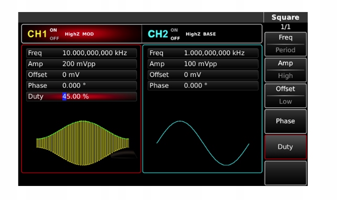 Генератор обеспечивает широкий выбор функций модуляции, как аналоговых, так и цифровых, т.е. AM, FM, PM, ASM, FSK, PSK, BPSK, QPSK, OSK, ШИМ, СУММ, QAM