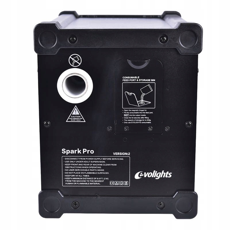 EVOLIGHTS SPARK PRO — полностью безопасное пиротехническое устройство. Для создания фейерверка она использует специальный порошок, который не вызывает ожогов при попадании на кожу, быстро горит, не создавая дыма и запаха, безвреден для окружающей среды. Машина идеальна как для создания фейерверка на свадьбе, так и во время специальных сценических постановок. Он прост в использовании и очень эффективен.