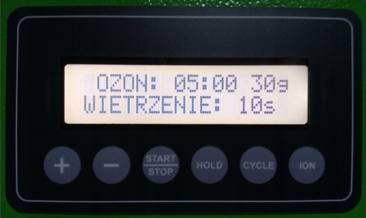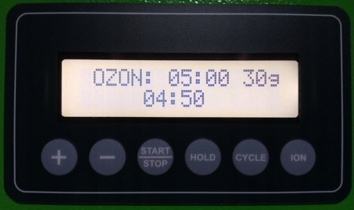 Озонатор оснащен буквенно-цифровым дисплеем (2 строки по 16 символов каждая) и клавиатурой (управление работой генератора озона и ионизатора).