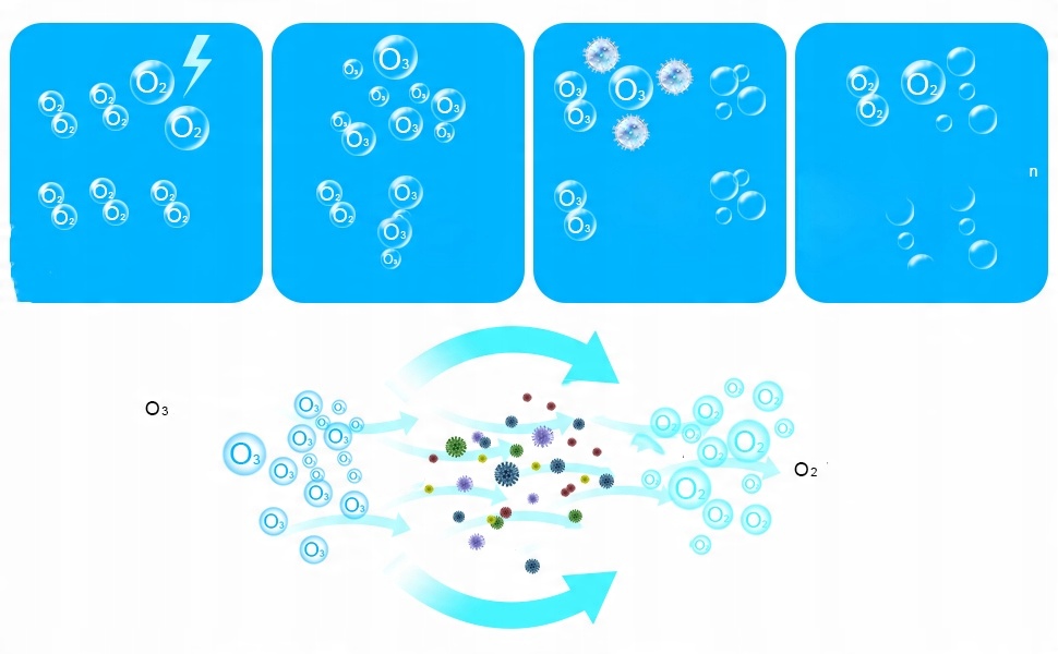 Озон вступает в реакцию с запахами в воздухе, воде, тканях, стены и потолки. В отличие от других типов систем очистки воздуха, работа генератора озона не зависит от потока воздуха, проходящего через машину.