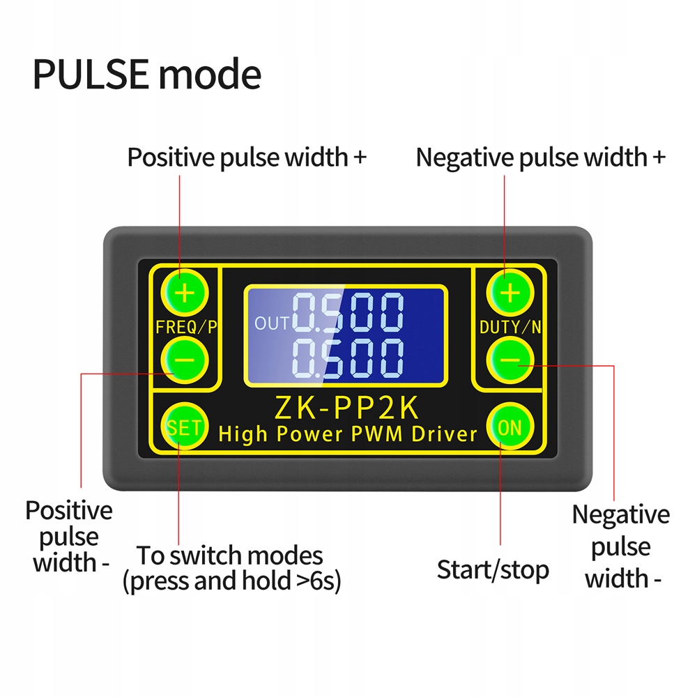 3. Интерфейс режима ШИМ отображает частоту и рабочий цикл; Интерфейс импульсного режима отображает положительную и отрицательную длительность импульса; Интерфейс настройки импульсного режима может отображать время задержки и количество импульсов.