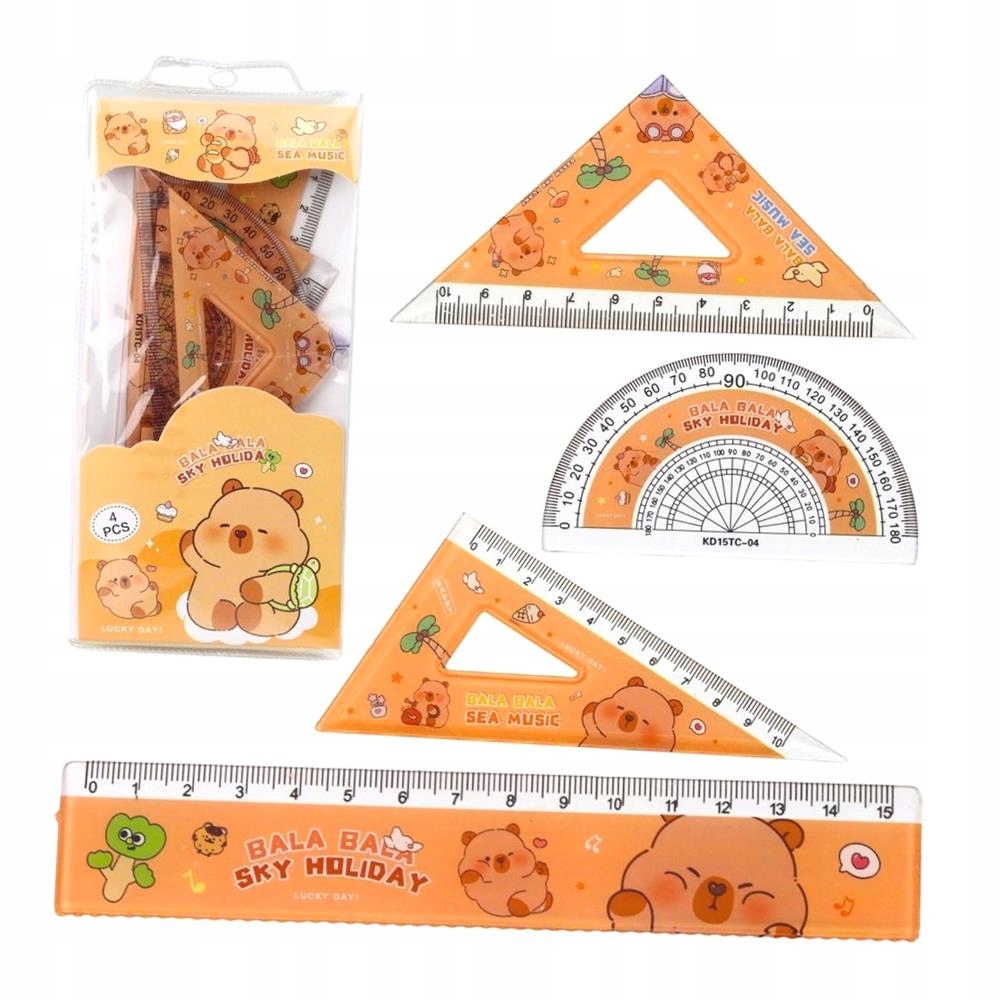 НАБОР ГЕОМЕТРИЧЕСКОЙ ПОСУДЫ CAPYBARA - 4 ЭЛЕМЕНТА Набор геометрической посуды с мотивом капибары - это практичный и в то же время очаровательный набор, который идеально подойдет для учебы в школе, занятий искусством и повседневного рисования. Каждый элемент набора украшен милыми иллюстрациями капибар и дружелюбными цветами, что делает его уникальным и эстетичным дополнением к школьному пеналу. В набор входят всего 4 элемента: линейка, квадрат 45, квадрат 60 и транспортир. Все приборы изготовлены из прочного и прозрачного пластика, что обеспечивает читаемость шкал и точность в использовании. Все упаковано в закрытый футляр с графикой, соответствующей тематике набора. Это идеальное предложение для учеников начальных классов и детей старшего возраста, которые любят сочетать обучение с эстетическими аксессуарами. СПЕЦИФИКАЦИЯ: Материал: пластик Состав набора: линейка, транспортир, 2 набора квадратов Графический мотив: капибара Размеры упаковки: 17,5 x 8,5 см Цвета: оранжевый с иллюстрациями СОСТАВ КОМПЛЕКТА: Прямая линейка Набор квадратов 45 Набор квадратов 60 Транспортир Упаковка с мотивом капибары
