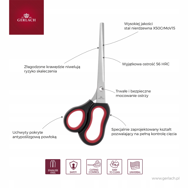 ножницы составляют 225 мм . Они упакованы в элегантную, красочную картонную коробку. Их не следует вымывать в посудомоечной машине, рекомендуется промывание ручного стира. Не оставляйте на них загрязнение, например, клей или фрагменты материалов. Они должны храниться в сухом месте и использовать для их цели. Образец ножниц был запатентован.