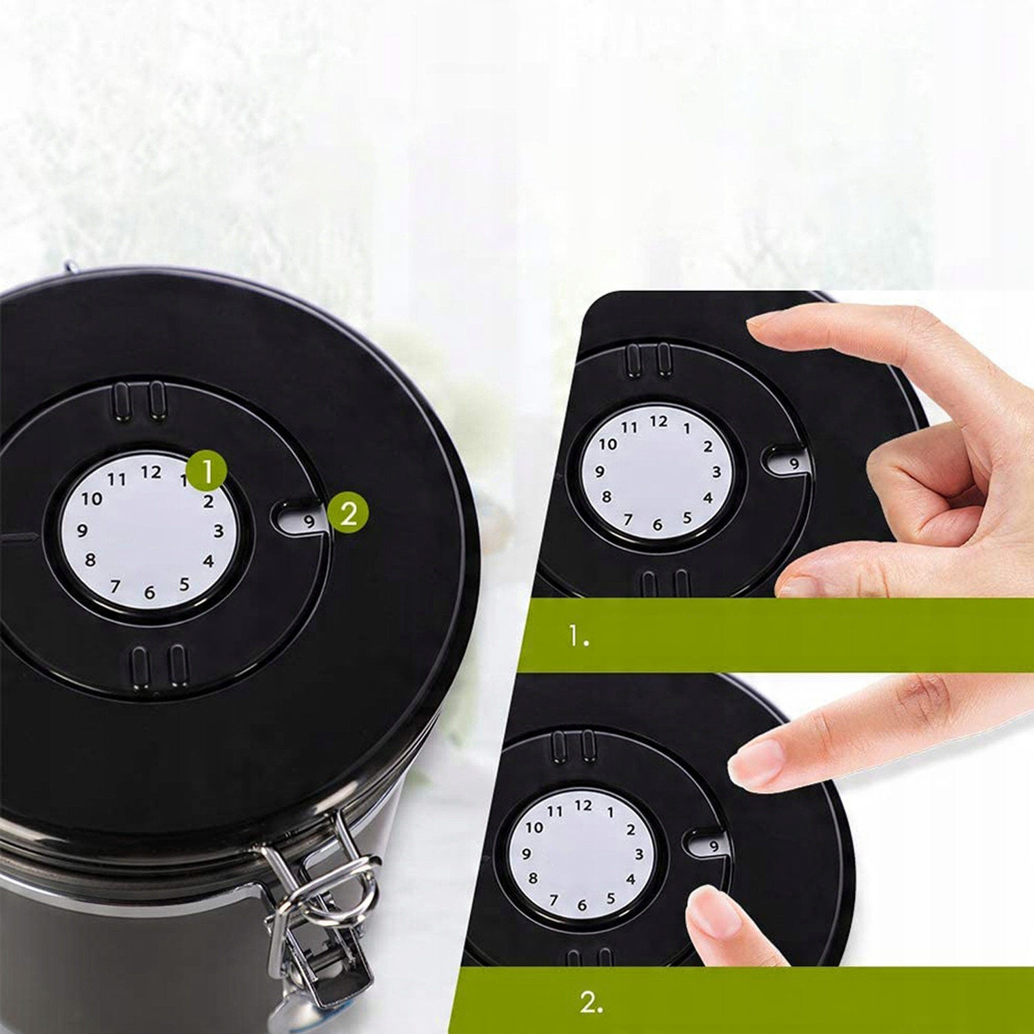 - С нашим контейнером для молотого кофе вы можете отслеживать дату и время, когда вы впервые сохранили зерна, чтобы гарантировать их свежесть с помощью встроенного циферблата даты.