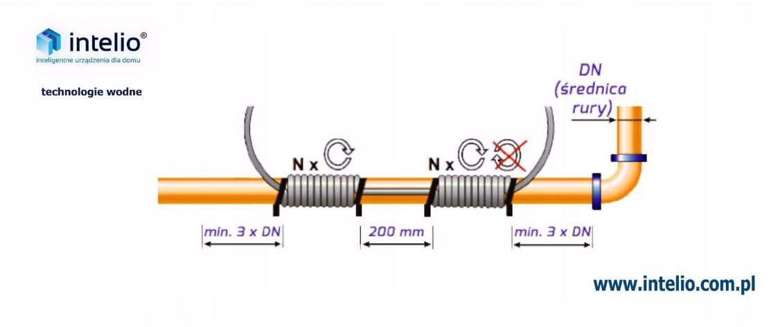 ВНИМАНИЕ! Катушки должны располагаться на ровной части трубопровода и на достаточном расстоянии от других конструкций трубопровода (отводов, тройников и т.п.). Минимальное расстояние должно быть больше наружного диаметра, на котором установлен трубопровод. пространство отсутствует, расстояние между змеевиками можно уменьшить до 100 мм. Однако длина активной колонки, благодаря которой устройство активно, будет сокращена.