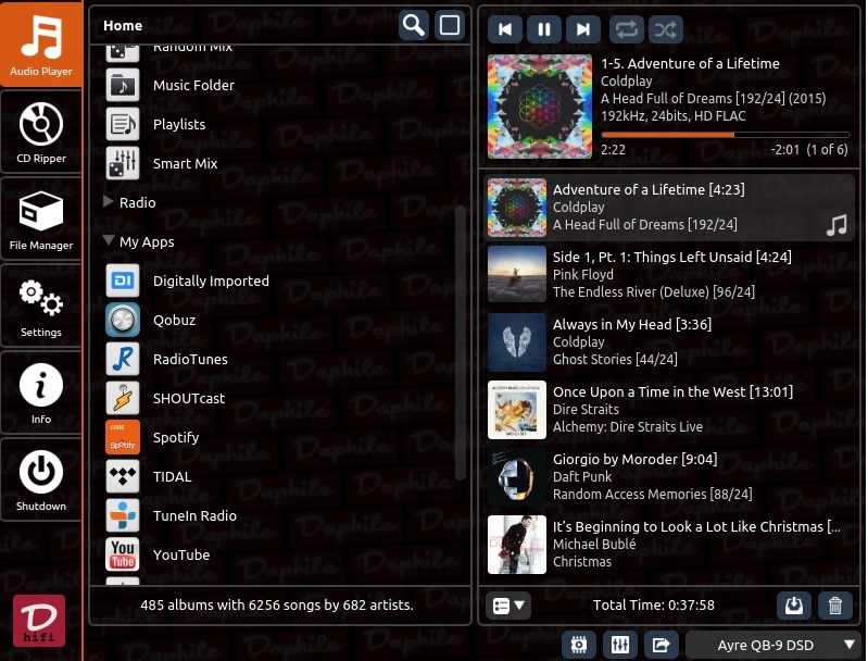 Наилучших результатов можно добиться, подключив к USB-выходу плеера Daphile USB преобразователь ЦАП в аналоговый.