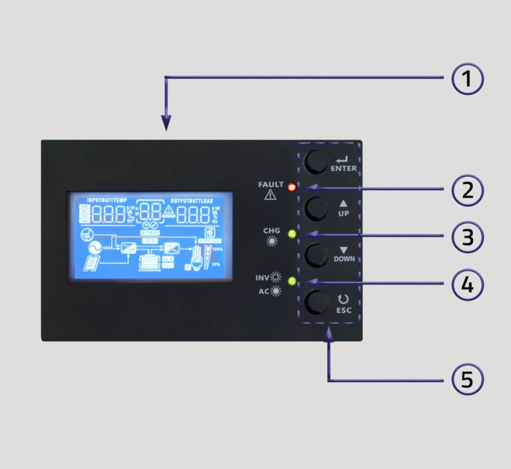 Изделие оснащено многофункциональным, простым в использовании ЖК-дисплеем с панелью управления. Это облегчает мониторинг всей фотоэлектрической установки. Позволяет настроить диапазон входного напряжения для домашних устройств и персональных компьютеров или изменить настройки приоритета зарядного устройства переменного/солнечного типа. Дополнительно дисплей фиксирует данные и информирует о сбоях, реагируя соответствующим образом, если какой-либо из параметров превышает норму. В случае возникновения неисправности инвертор выключается. На панели справа расположены индикатор режима работы, индикатор ошибок и индикатор зарядки.