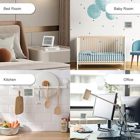 - 【Широкое применение】 Цифровой измеритель влажности воздуха широко используется в жилых комнатах, теплицах, детская комната, комната музыкальных инструментов, гардеробная, подвал, кабинет, подвал, склад, ожидание.
