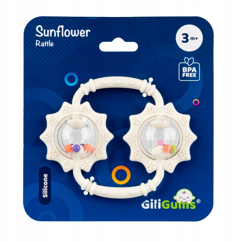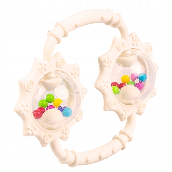 Во-первых, в ней целых два шарика, наполненных бисером, во-вторых, она совмещает в себе функцию погремушки и прорезывателя. Разноцветные бусины каждый раз издают веселый звук ты трясешь игрушку. Их окружают мягкие обручи в форме подсолнухов, украшенные выступами различной формы. Благодаря этому при надкусывании лепестков цветка выступы будут массировать воспаленные десны ребенка, принося облегчение. Удобные ручки, соединяющие цветы, облегчают удержание игрушки маленькими ручками.