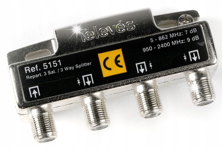 Высокий -класс ветвь 1/3 Телевес ref. 519503, или 1 вход, 3 выходов , работает в диапазоне 5 МГц - 2400 МГц . Это позволяет вам разделить «DVB-T2 наземного телевизионного сигнала или кабельный DVB-C на три телевизора . Он работает с однозначной системой в сателлитных установках на основе этого типа преобразователя и . Эффективность Благодаря миниатюрной деятельности, используемой в электронных компонентах