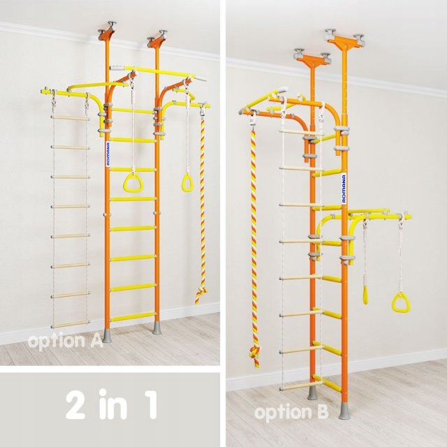 Продукция изготовлена с максимальной тщательностью и продумана до каждой детали. В конструкции сочетаются металлические, пластиковые и деревянные элементы. Все крепления – винты и гайки – спрятаны под пластиковыми заглушками, металлические торцы имеют ровные, гладкие поверхности. Гимнастические принадлежности подвешиваются на клипсе-направляющей, что предотвращает их скольжение по лестнице. Лестница приобретает эстетичный вид и хорошо смотрится в помещении.