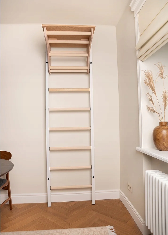 Вдохновлен классической деревянной лестницей и сочетается с металлическими профилями с матовым порошковым покрытием. Дополните любой интерьер многофункциональной спортивной мебелью, которая одновременно практична и эстетична.