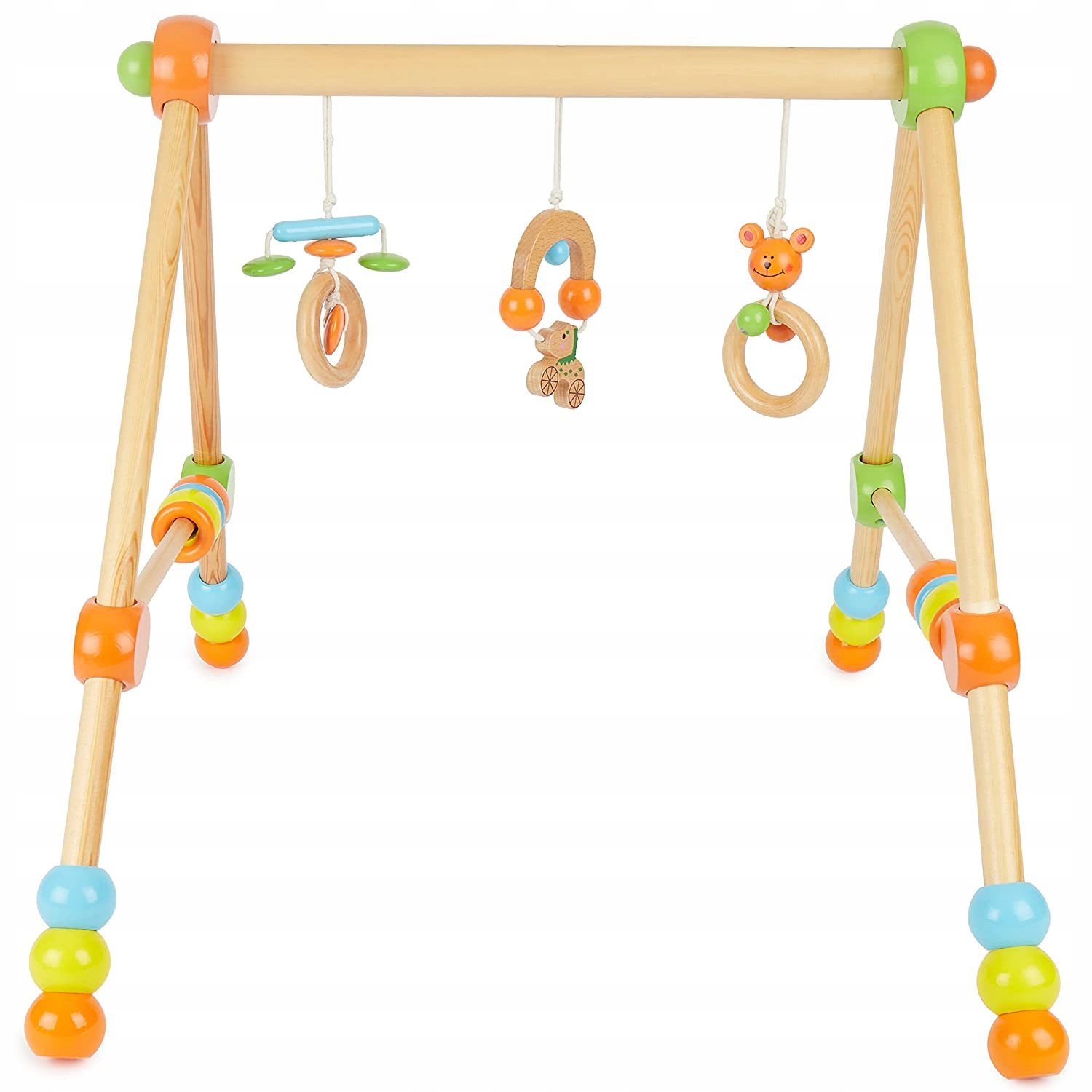 Гимнастическая перекладина спроектирована в таким образом, чтобы подвеска висела свободно, а лежащий под ней ребенок вытягивал руки вверх, пытаясь ухватиться за деревянные элементы.