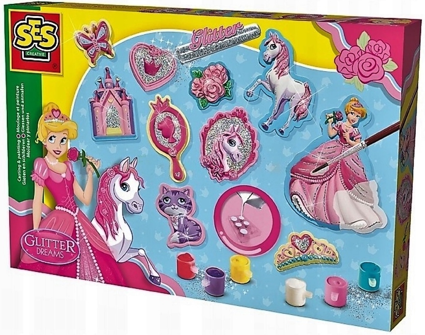 Отливка гипсовых фигурок – это очень весело! Представленный набор предлагает специальную форму, из которой мы можем создать принцессу, и аксессуары в различных конфигурациях. Как только мы завершим первый этап, то есть отливку гипсовых форм, мы сможем приступить к следующей задаче — покраске слепков. У нас есть 6 красок, практичная кисть и блестки для украшения ваших работ. Этот набор подарит детям массу удовольствия на долгие часы! SES Creative — голландский производитель креативных игрушек для детей.