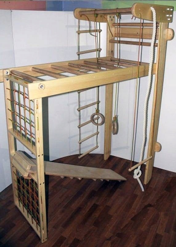 Чтобы разнообразить занятия ребенка, стоит позаботиться о домашнем укрепляющем устройстве — устойчивой лесенке, обеспечивающей много движений и безопасную деятельность. Деревянный тренажер можно разместить на ступеньке любой гимнастической лестницы и успешно выполнять одновременно несколько функций: развлекательную функцию скалодрома и гимнастическую функцию доски для растяжки позвоночника на лестнице.