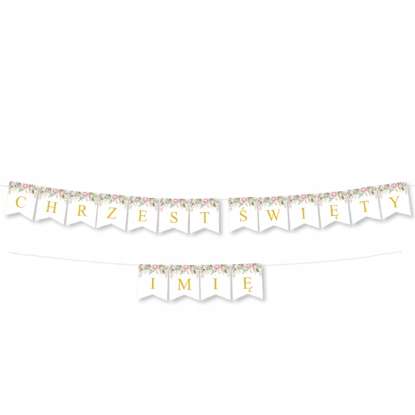 Измерения вымпела: ок. 16,8 см х 14 см Длина всей гирлянды: ок. 1,8 м + имя ребенка Набор включает в себя 13 бумажных вымпел + имя и 4 м белой ленты.