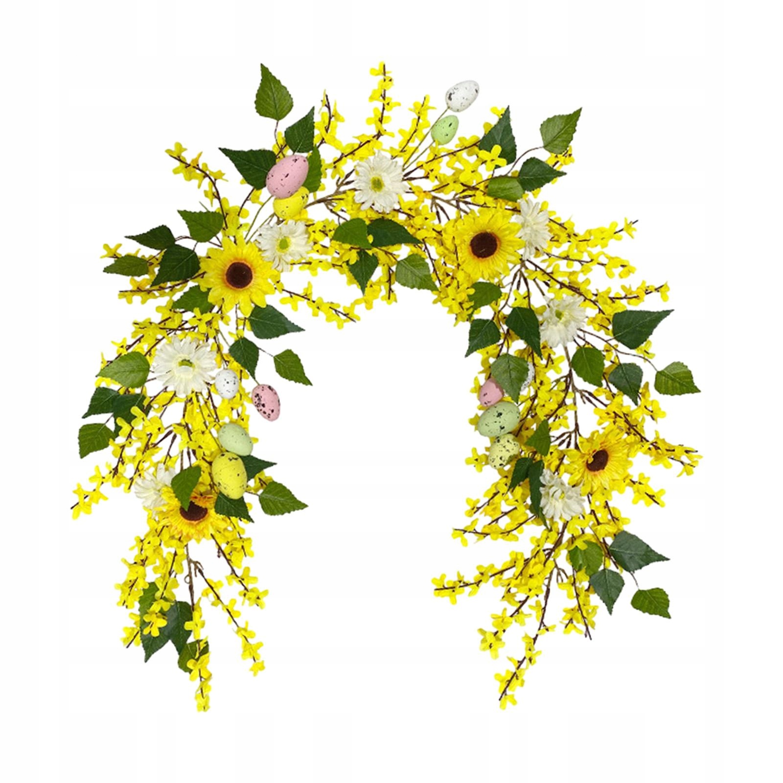 [Отчет] Гирлянда с цветами пасхального яйца с разноцветными яйцами, искусственными подсолнухами, желтыми цветами, ветвями и зелеными листьями, красивыми и яркими.