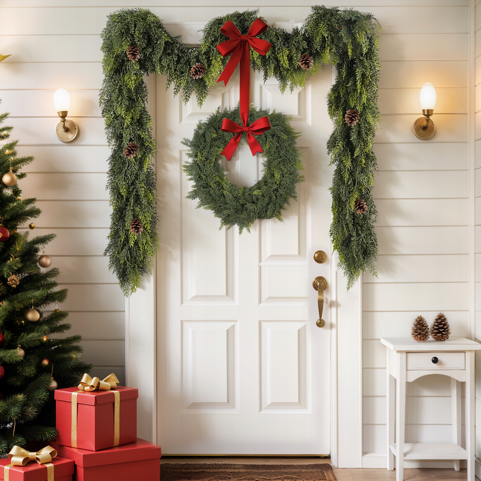 ✨ Плотность 1,8 м — достаточно для любого места! В комплект входит кедровый венок длиной 1,8 м (6 футов), прочно связанный и напоминающий настоящую кедровую ветку. Его внушительные размеры идеально подходят для украшения больших поверхностей: входной двери (основной вход в дом), дымохода (среднее место в гостиной) или лестницы (образует рождественскую дорожку). Неважно, где вы его разместите — он придаст характер и теплоту любой комнате!