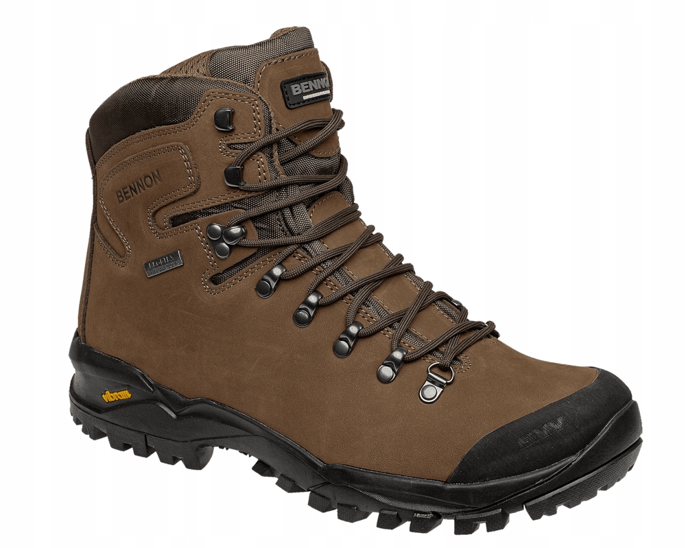 БОТИНКИ TERENNO HIGH/ BENNON. Кожаные трекинговые ботинки с водонепроницаемой мембраной REGI-TEX® и нескользящей подошвой VIBRAM®. Удобная трекинговая обувь, обеспечивающая хорошее сцепление, долговечность и поддержку суставов в сложных условиях местности. Обувь имеет хорошую амортизацию и поддержку, что помогает снизить нагрузку на ноги во время длительных походов, обеспечивает комфорт и помогает избежать травм. Твердая подошва обеспечивает хорошее сцепление с различными типами местности, что важно при скалолазании, ходьбе в горах и при ходьбе по каменистым тропам. Цвет: коричневый.Верх: верх - нубук. Подкладка - мембрана REGI-TEX®. Подкладка - АБСОРБА. Конструкция: высокий верх с мягким воротником и язычком, регулируемый шнурками, слой спереди, защищающий обувь от истирания, резиновая подошва Vibram® S1021 хорошей формы. Подошва VIBRAM® — одна из лучших в своем классе, ее часто выбирают производители спортивной и уличной обуви благодаря превосходному сцеплению, долговечности и стойкости к истиранию, она будет соответствовать самым разным потребностям и условиям. Применение: горный туризм, альпинизм, экспедиции в труднодоступные места, полевые работы (лесники, природоохранники).