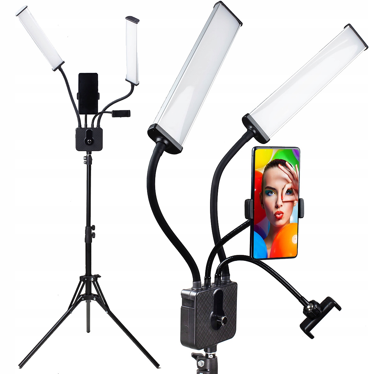 Двуручная светодиодная лампа с держателем для телефона, штативом и сумкой
